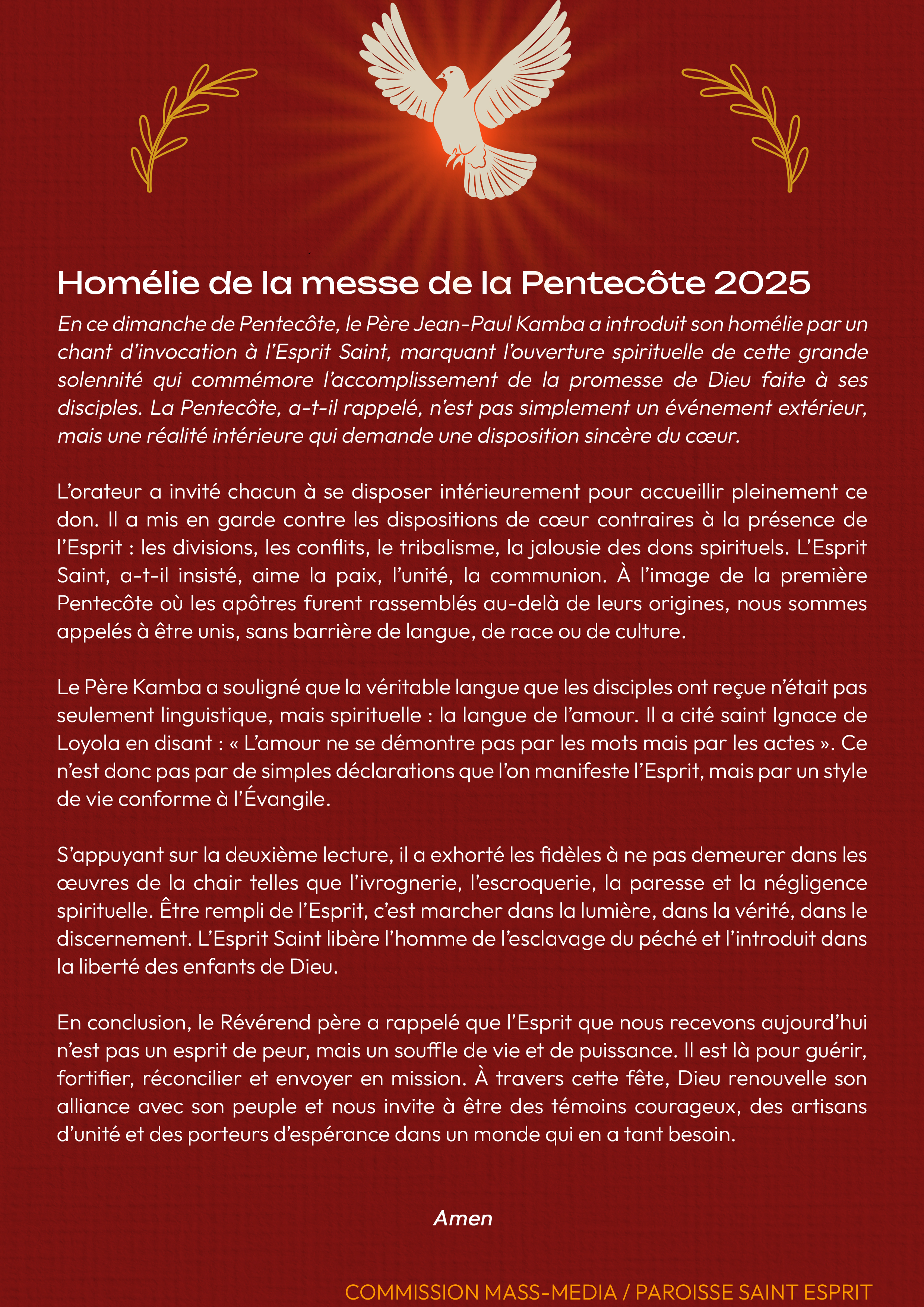 Le dimanche 20 avril 2025, Dimanche de Pâques, a été un jour mémorable pour tous les fidèles de la Paroisse et de l'Aumônerie Catholique Saint Esprit. Dans une ambiance spirituelle profonde marquée par la Résurrection du Christ, la messe solennelle a été présidée par Son Excellence Monseigneur l'Archevêque, entouré de nombreux prêtres, autorités et fidèles venus nombreux pour célébrer cet événement central de la foi chrétienne. À la fin de la célébration eucharistique, tous se dirigent en procession vers le site du nouveau bâtiment de l'école maternelle de la paroisse. C'est dans un esprit de fête et de reconnaissance que l'Archevêque a procédé à la bénédiction officielle de cette nouvelle infrastructure éducative, fruit des efforts conjoints de la communauté paroissiale et de ses partenaires. Des discours ont été prononcés pour saluer cet accomplissement important pour l'avenir des enfants et l'éducation dans la foi. La communauté s'est ensuite réunie autour d'un moment de convivialité, partageant chants, danses, douleur et joie pascale.